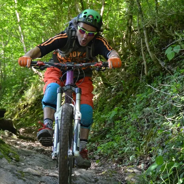 Ce tour est dans la plus pure tradition « enduro ». Une montée qui passe bien sur la route du col de Lourdios (elle peut se faire en navette), et sans transition, la trace plonge directement sur Sarrance. La descente est un véritable festival d’épingles, racines et roche, sans le moindre mètre à remonter. Quelques passages en dévers séparent les virages à négocier avec finesse. Quelques pierriers complètent le tableau (gare au dérailleur), et affutent le sens de la trajectoire. La variante par le Calvaire est tout aussi sympathique. Il est important de noter que c’est un sentier partagé, il est possible de croiser des piétons, prudence dans les zones sans visibilité et merci de laisser le marcheur PRIORITAIRE !